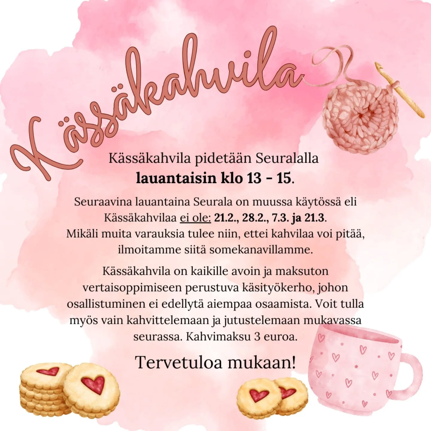 Seuraavina lauantaina Seurala muussa käytössä eli Kässäkahvilaa ei ole: 21.2., 28.2., 7.3. ja 21.3.